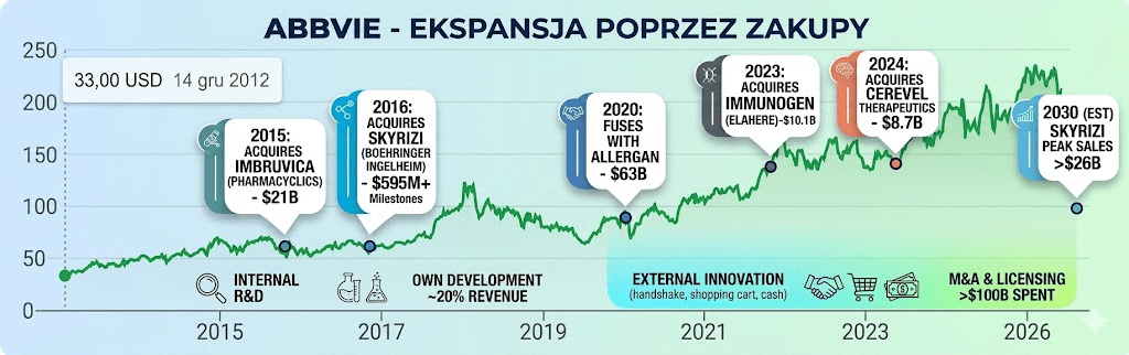 Od 2015 r., AbbVie prowadziło agresywną politykę przejęć projektów i całych spółek, dzięki potężnym przychodom z najlepiej sprzedającego się ówcześnie leku na świecie, czyli Humiry właśnie. Było co wydawać — Humira wygenerowała 12 mld USD sprzedaży w 2014 r., rosnąc do ponad 21 mld USD w 2022 r.